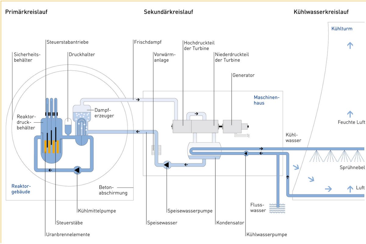 Ein bisschen Rost, was kann das schaden? In Druckwasserreaktoren, von denen neben GKN II fünf weitere Anlagen in Deutschland am Netz sind, katastrophal viel! Dies lässt sich verstehen, wenn man das Bauprinzip dieses Reaktortyps kennt: So erhitzen die Brennelemente während der Kernspaltung das Wasser im Druckgefäß auf etwa 320 Grad Celsius. Bei normalem Luftdruck wäre das Wasser bei dieser Temperatur längst verdampft. Deshalb wird es unter extrem hohen Druck von knapp 160 Bar flüssig gehalten. Pumpen fördern es durch Rohrleitungen vom Reaktor zum Dampferzeuger, wo es seine Wärme über die Heizrohre an einen zweiten Kreislauf abgibt. Das Wasser im Sekundärkreislauf verdampft und treibt die Turbine an. Nachdem der Dampf die Turbinen verlassen hat, wird er in einem Kondensator abgekühlt und als Wasser wieder in den Dampferzeuger zurückgepumpt. Die dabei entstehende große Wärmemenge, zwei Drittel der gesamten Leistung des AKWs, wird durch den Kühlturm abgeleitet.