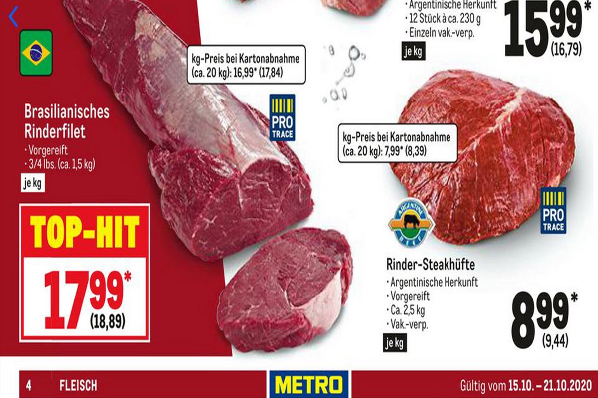 Auf Anfrage nach Herkunft des Angebotsfleischs, Preisgestaltung und ethischer Vertretbarkeit des Verkaufs brasilianischen Rindfleischs antwortete die Metro AG kurz vor Redaktionsschluss ausführlich, aber unkonkret. "Metro arbeitet bereits seit 20 Jahren aktiv an Nachhaltigkeits-Themen und für den Umweltschutz", schreibt das Unternehmen. Es gehöre zu seinen Grundsätzen, ausschließlich Produkte zu führen,"die den höchsten Ansprüchen an Qualität und Sicherheit genügen". Zudem arbeite es derzeit mit seinen Fleischlieferanten daran, "Entwaldung aus unserer Lieferkette auszuschließen. Zurzeit laufen die Arbeiten an einer entsprechenden Einkaufspolitik zu Fleisch, die noch im Laufe dieses Jahres veröffentlicht werden soll."