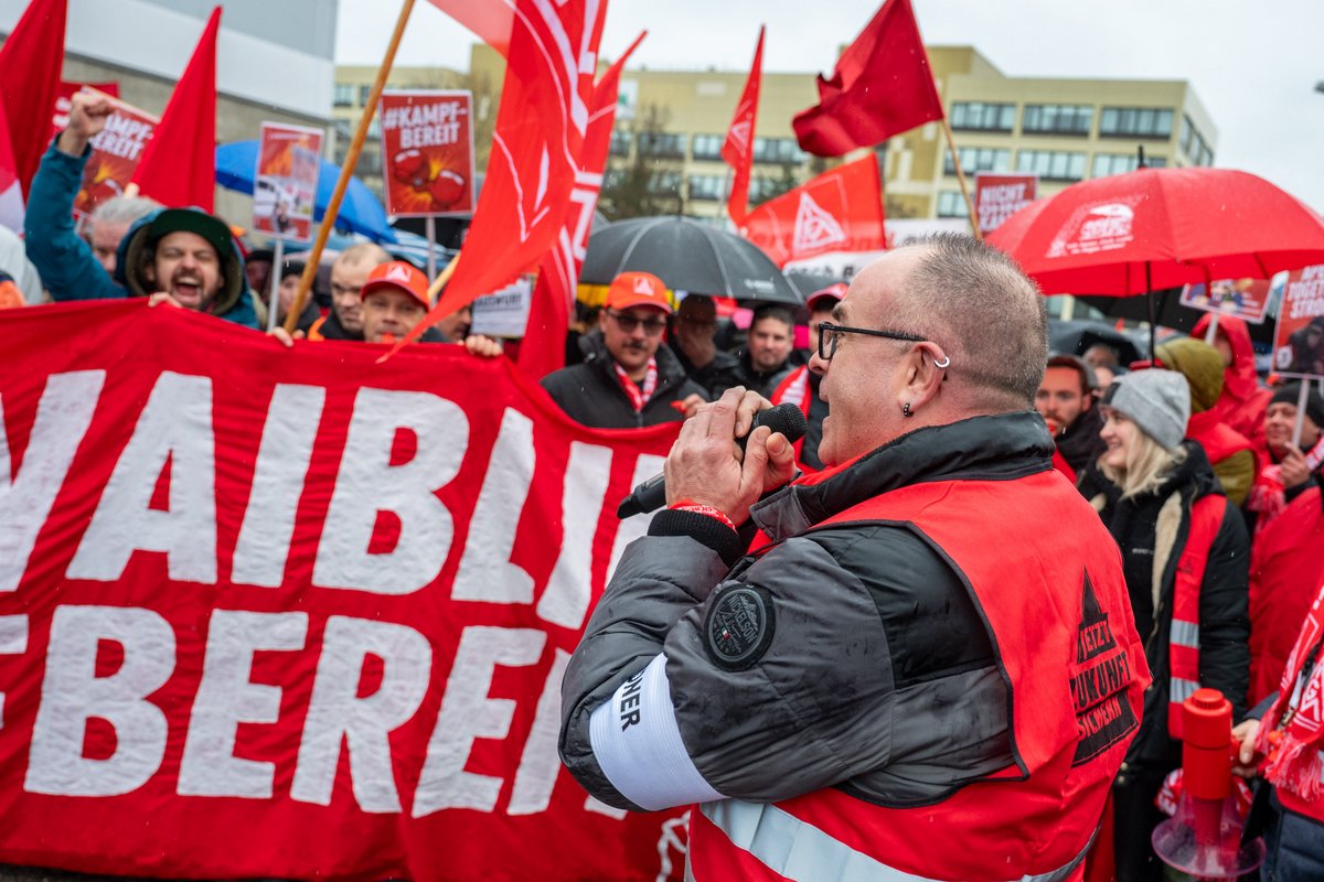 Das trifft die Stimmung der etwa 2.000 Demonstrat:innen ganz gut. Sie sind wütend, wollen sich wehren gegen die Schließung des Werkes. Boschler:innen aus anderen Standorten wie Gerlingen-Schillerhöhe, Leonberg, Hildesheim in Niedersachsen, Bamberg in Bayern oder Homburg im Saarland sind da, dazu Kolleg:innen von Mercedes und Siemens. Vor vier Wochen hatten der Waiblinger Betriebsrat, Vertrauensleute und die IG Metall beschlossen, den Unmut über das Vorgehen von Bosch auf die Straße zu bringen. 13.000 Arbeitsplätze will der Konzern in den nächsten Jahren in Deutschland vernichten, bereits beschlossen und mit Sozialplan ausgehandelt sind die Schließungen der Bosch Power Tools Werke in Leinfelden und in Sebnitz (Kontext berichtete hier und hier). Protestaktionen dort waren überschaubar, und so war die Spannung groß, wie viele wohl nach Waiblingen kommen würden.