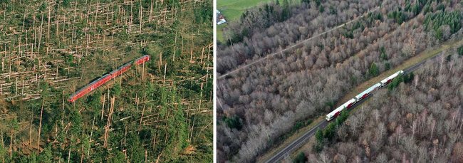 "Die Natur hat den Wald zurück erobert", schreibt Manfred Grohe unter seine Bilder für Kontext, und spendet damit Trost und Hoffnung am Jahresende. Vor 20 Jahren, am zweiten Weihnachtsfeiertag, hatte "Lothar" zugeschlagen und kaum hatte sich der Sturm gelegt, war der Fotograf in der Luft. Über dem Schönbuch zwischen Tübingen und Herrenberg, wo es so aussah, als führe die Eisenbahn durch einen Streichholzwald. Jetzt ist der 81-Jährige wieder in die viersitzige Morane gestiegen, um zu schauen, was daraus geworden ist, allen Schadensberichten zum Trotz. Und siehe da: alles wieder da und "nix von Hand gemacht".