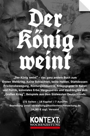 "Der König weint" kann ab sofort über die Redaktion bestellt und bezogen werden. Der 172 Seiten starke Band fasst in 18 Kapiteln die gleichnamige Serie über den Weltkrieg im Südwesten zusammen, die in der ersten Jahreshälfte in Kontext erschienen ist. Die Artikel-Sammlung, die von Kontext-Autor Wilhelm Reschl bearbeitet wurde und von dem studierten Historiker herausgegeben wird, kann ab sofort per Email über <link>verwaltung@kontextwochenzeitung.de oder telefonisch unter 0711 - 66 48 65 48 bestellt werden.