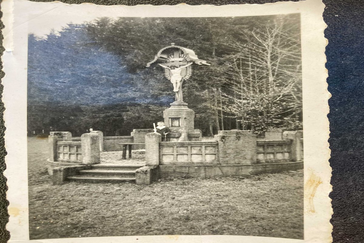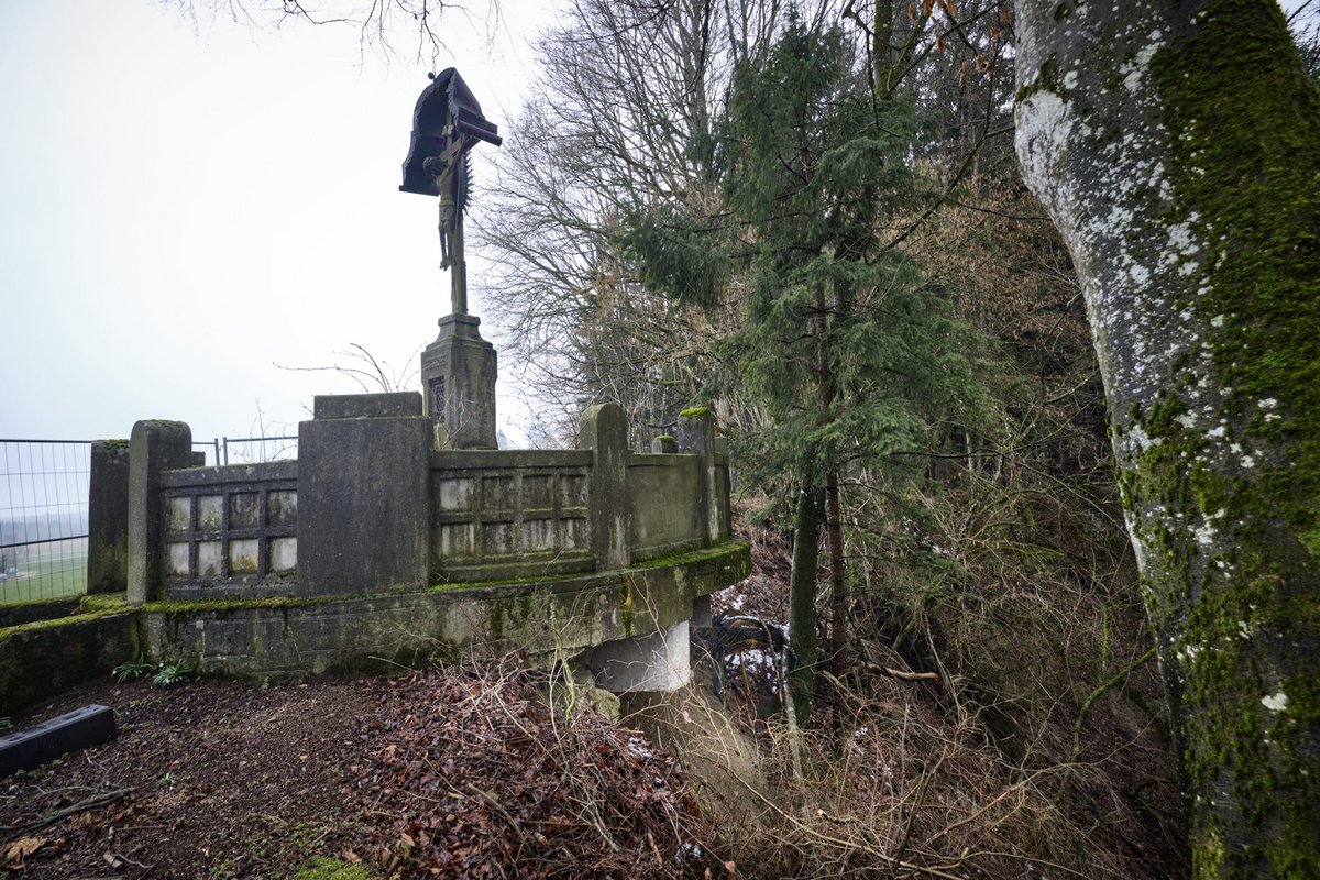 Es ist ein Arma-Christi-Kreuz am Rand eines steil abfallenden Tobels, fast fünf Meter hoch, inmitten eines gemauerten Rondells, das zusammenzubrechen droht. Der Corpus Christi ist noch stabil, aber das Dach hält nicht mehr lange, die Folterwerkzeuge seiner Peiniger sind brüchig, der Überlieferung nach hat er durch seine Auferstehung an Ostern über sie gesiegt und seinen Gläubigen Erlösung und Trost gebracht.
